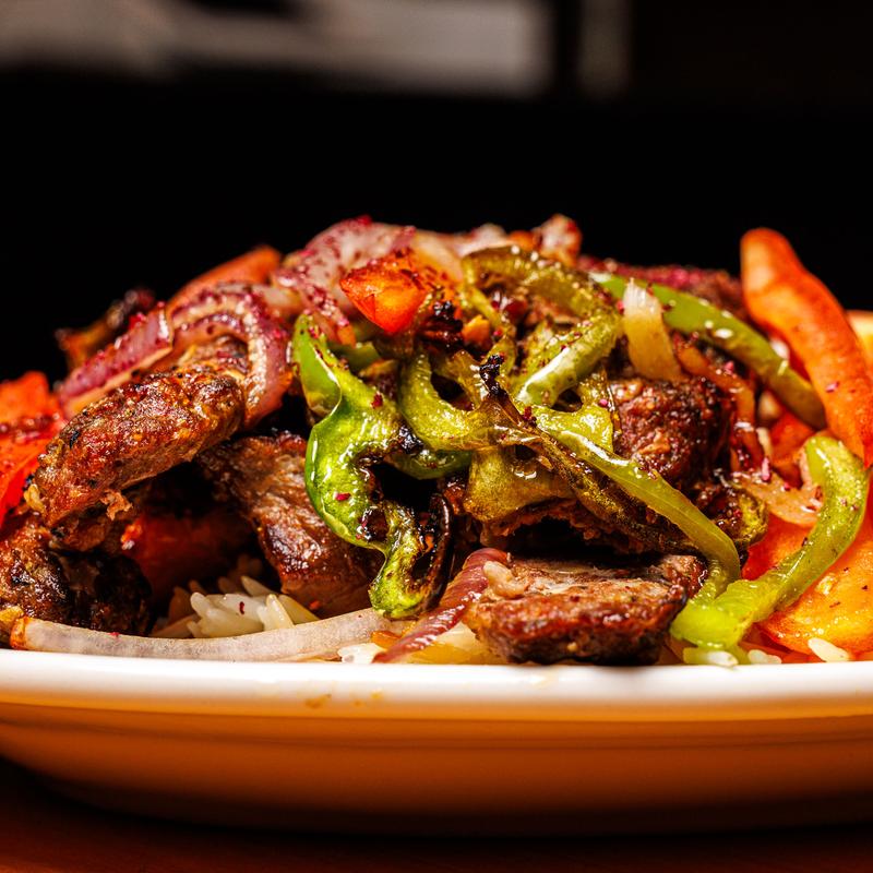 Served over rice with onions, cilantro, and homemade sauce.